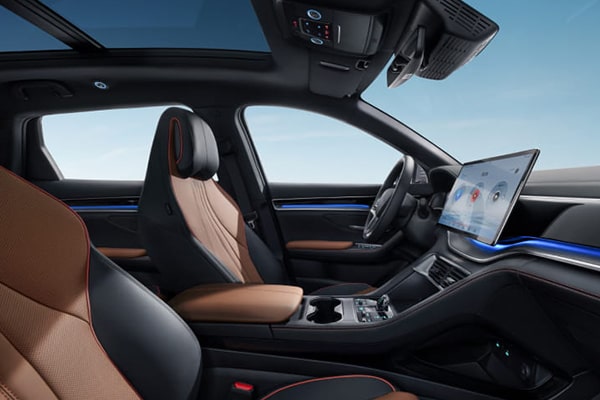 Le BYD SEALION 6 offre un habitacle fonctionnel au design futuriste. Sa console centrale flottante, son écran tactile rotatif intelligent, et son double espace de rangement allient élégance et fonctionnalité. Un intérieur pensé pour allier style, technologie et praticité.